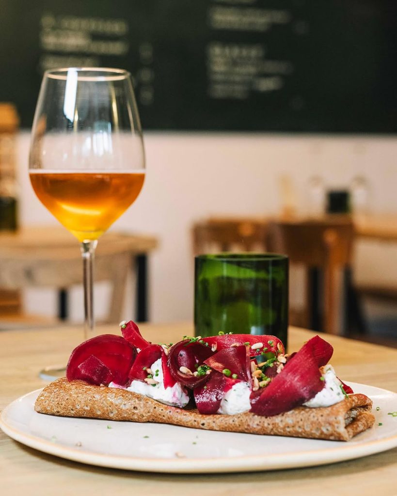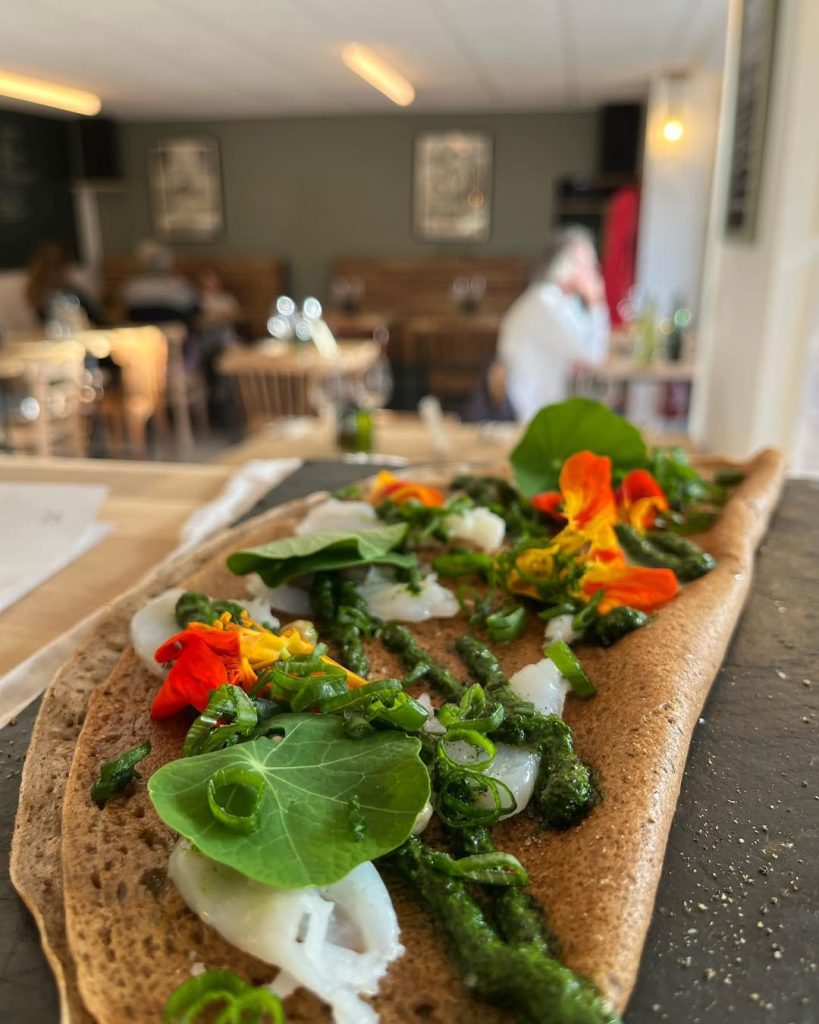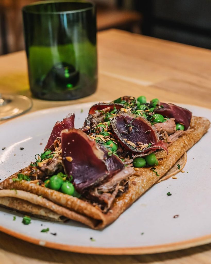 Oubliez les crêperies folkloriques et leurs nappes à carreaux. Gwinizh Du (« blé noir » en breton) réinvente le genre avec une audace tranquille. Dans ce bistrot contemporain au bois clair et aux murs épurés, on mise sur le local — 90 % des produits viennent d’un rayon de 30 km — et sur l’innovation. Les galettes, bien sûr, mais aussi des créations fermentées, des associations inattendues, et cette liberté : « Composez vous-même », propose le menu, griffonné à la craie sur une ardoise. Le résultat ? Une cuisine généreuse, ancrée dans son temps, qui prouve que la tradition peut se dépoussiérer sans se renier.