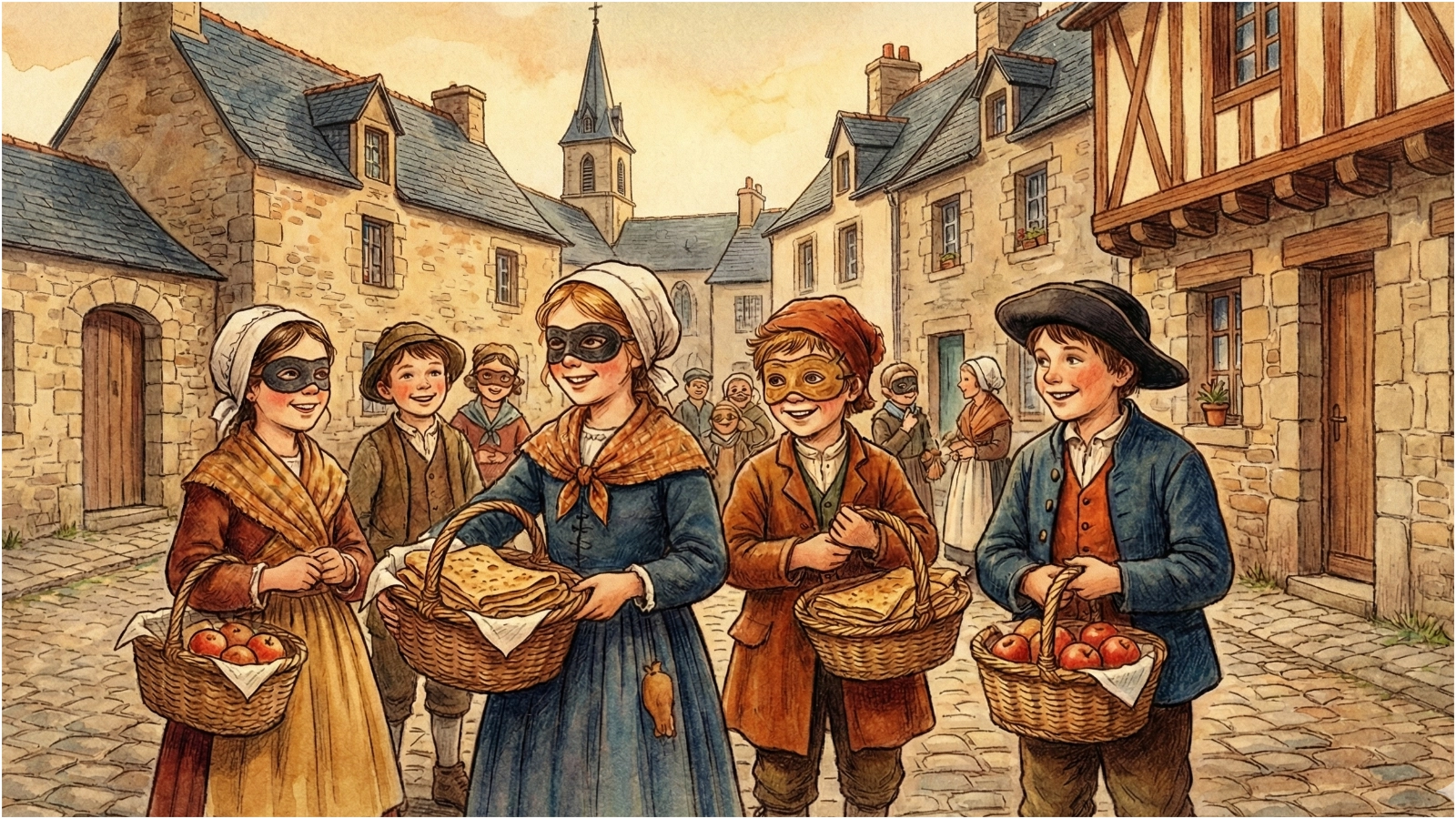 Bien avant que les petits monstres d’Halloween ne débarquent en octobre, les enfants bretons faisaient déjà du porte-à-porte pour Mardi Gras. Déguisés avec ce qu’ils trouvaient (souvent des vieux vêtements d’adultes, de la suie sur le visage pour se « masquer »), ils allaient de ferme en ferme. Pas de « bonbons ou un sort », mais des chansons ! Ils chantaient des comptines en breton pour recevoir en échange des crêpes, des pommes, ou quelques sous.